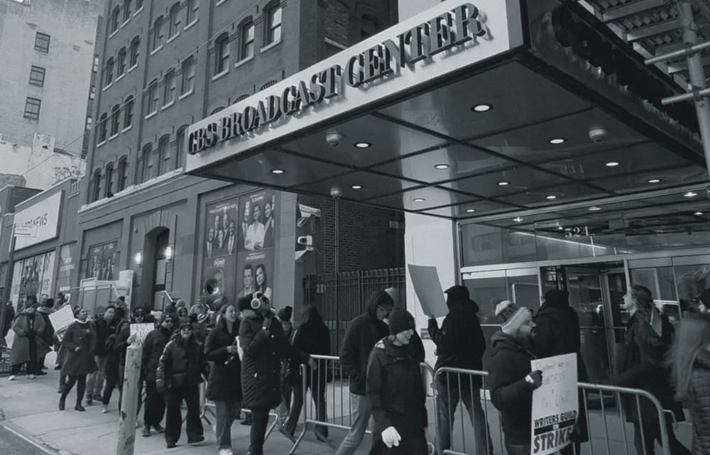 Members of the Writers Guild of America picket in front of CBS headquarters in New York. (Photo via WGA East)